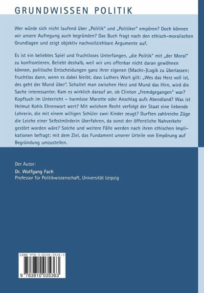 Wer würde sich nicht laufend über "Politik" und "Politiker" empören? Doch können wir unsere Aufregung auch begründen? Das Buch fragt nach den ethisch-moralischen Grundlagen und zeigt objektiv nachvollziehbare Argumente auf. Es ist ein beliebtes Spiel und fruchtloses Unterfangen, "die Politik" mit "der Moral" zu konfrontieren. Beliebt deshalb, weil wir uns offenbar nicht daran gewöhnen können, politische Entscheidungen ganz ihrer eigenen (Macht-)Logik zu überlassen; fruchtlos dann, wenn es dabei bleibt, dass Luthers Wort gilt: "Wes das Herz voll ist, des geht der Mund über." Schaltet man zwischen Herz und Mund das Hirn, wird die Sache interessanter. Kam es wirklich darauf an, ob Clinton "fremdgegangen" war? Kopftuch im Unterricht - harmlose Marotte oder Anschlag aufs Abendland? Was ist Helmut Kohls Ehrenwort wert? Mit welchem Recht verfolgt der Staat eine liebende Lehrerin, die mit einem willigen Schüler zwei Kinder zeugt? Durften zahlreiche Züge die Leiche einer Selbstmörderin überfahren, da sonst der öffentliche Nahverkehr gestört worden wäre? Solche und weitere Fälle werden nach ihren ethischen Implikationen befragt: mitdem Ziel, das Fundament unserer Urteile von Empörung auf Begründung umzustellen.