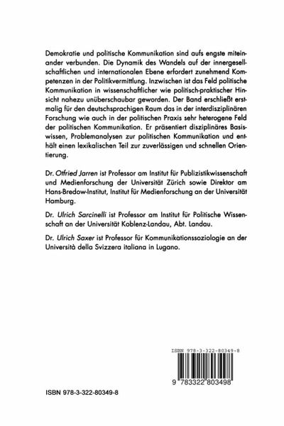 Dr. Otfried Jarren ist Professor am Institut für Publizistik der Universität Zürich sowie Direktor am Hans-Bredow-Institut für Medienforschung an der Universität Hamburg. Dr. Ulrich Sarcinelli ist Professor am Institut für Politische Wissenschaft an der Universität Koblenz-Landau, Abt. Landau. Dr. Ulrich Saxer war Professor für Kommunikationssoziologie an der Università della Svizzera italiana in Lugano.
