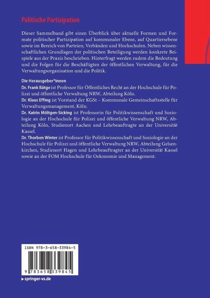 Dieser Sammelband gibt einen Überblick über aktuelle Formen und Formate politischer Partizipation auf kommunaler Ebene, auf Quartiersebene sowie im Bereich von Parteien, Verbänden und Hochschulen. Neben wissenschaftlichen Grundlagen der politischen Beteiligung werden konkrete Beispiele aus der Praxis beschrieben. Hinterfragt werden zudem die Bedeutung und die Folgen für die Beschäftigten der öffentlichen Verwaltung, für die Verwaltungsorganisation und die Politik.