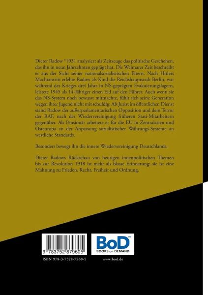 Dieter Radow _1931 analysiert als Zeitzeuge das politische Geschehen, das ihn in neun Jahrzehnten geprägt hat. Die Weimarer Zeit beschreibt er aus der Sicht seiner nationalsozialistischen Eltern. Nach Hitlers Machtantritt erlebte Radow als Kind die Reichshauptstadt Berlin, war während des Krieges drei Jahre in NS-geprägten Evakuierungslagern, leistete 1945 als 14-Jähriger einen Eid auf den Führer. Auch wenn sie das NS-System noch bewusst mitmachte, fühlt sich seine Generation wegen ihrer Jugend nicht mitschuldig. Als Jurist im öffentlichen Dienst stand Radow der außerparlamentarischen Opposition und dem Terror der RAF, nach der Wiedervereinigung früheren Stasi-Mitarbeitern gegenüber. Als Pensionär arbeitete er für die EU in Zentralasien und Osteuropa an der Anpassung sozialistischer Währungs-Systeme an westliche Standards.Besonders bewegt ihn die innere Wiedervereinigung Deutschlands. Dieter Radows Rückschau von heutigen innenpolitischen Themen bis zur Revolution 1918 ist mehr als blasse Erinnerung; sie ist eine Mahnung zu Frieden, Recht, Freiheit und Ordnung.