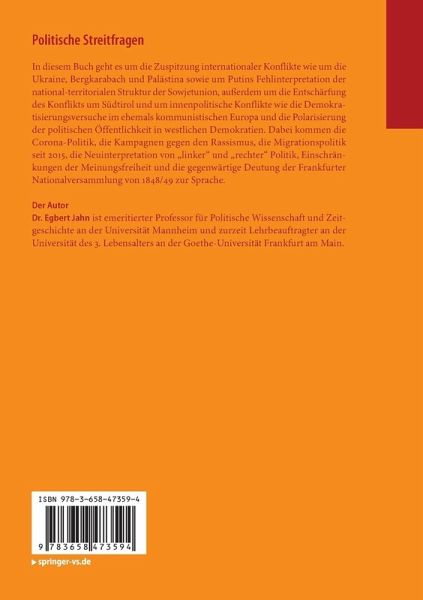 In diesem Buch geht es um die Zuspitzung internationaler Konflikte wie um die Ukraine, Bergkarabach und Palästina sowie um Putins Fehlinterpretation der national-territorialen Struktur der Sowjetunion, außerdem um die Entschärfung des Konflikts um Südtirol und um innenpolitische Konflikte wie die Demokratisierungsversuche im ehemals kommunistischen Europa und die Polarisierung der politischen Öffentlichkeit in westlichen Demokratien. Dabei kommen die Corona-Politik, die Kampagnen gegen den Rassismus, die Migrationspolitik seit 2015, die Neuinterpretation von "linker" und "rechter" Politik, Einschränkungen der Meinungsfreiheit und die gegenwärtige Deutung der Frankfurter Nationalversammlung von 1848/49 zur Sprache.