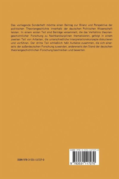 Über die Vernachlässigung der Theoriengeschichte als Teil der Politischen Wissenschaft.- Politische Ideengeschichte, Politikwissenschaft und Philosophie.- Einige anthropologische Prämissen und ihre Konsequenzen in politischen Theorien.- Theoriengeschichte und Naturwissenschaften. Über gemeinsame Paradigmen.- Staat und Politik. Zur Semantik der Selbstbeschreibung politischer Systeme.- Über das Studium der politischen Ideen in philosophischhistorischer Absicht.- Materialistische Ansätze in der Analyse politischer Ideen.- Die Rolle der Theoriengeschichte in der amerikanischen Politikwissenschaft.- Ein "glücklicher" Positivist. Bemerkungen zu Michel Foucaults "Erneuerung" der Theoriengeschichte.- Legitimationen politischer Gewalt. Zur Funktion der Ideologie im italienischen Linksterrorismus der 70er Jahre.- Was war wichtig? Von der Identitätspräsentationsfunktion zur Inkompetenzkompensationskompetenz.- Hat Theoriegeschichte Sinn? Anmerkungen zum Forschungsstand einer Teildisziplin.- Autorenverzeichnis.