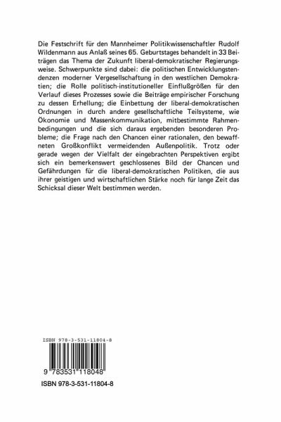 Vorbemerkung des Herausgebers.- Zur Einführung.- I. Entwicklungen, Probleme und Perspektiven demokratischer Ordnungen.- Donato Giannotti und die Konzeption republikanischer Gewaltenteilung.- Die Wahl als bürgerliche Amtshandlung.- Wachstum zu Grenzen - Stabilisierung durch Wandel. Zur historischen Lage der entwickelten Wohlfahrtsstaaten Westeuropas.- Einige Grundprobleme der Demokratie in der Informationsgesellschaft.- Zur Diskussion um Krise und Innovationschancen in westlichen Demokratien.- Freiheit und Ordnung. Der europäische Beitrag zur Lösung der ordnungspolitischen Probleme.- Die freien Gesellschaften - eine kleine radikale Minderheit?.- II. Demokratie im Spannungsfeld von Macht, Konflikt und Konsens.- Selbstgefährdungstendenzen von freiheitlichen Demokratien.- Marktwirtschaftliche Ordnungspolitik im demokratischen Wohlfahrtsstaat.- Gewerkschaften in der Krise.- Verteilungskonflikte, wirtschaftspolitische Strategien und politische Unterstützung. Eine vergleichende Simulationsstudie für die Bundesrepublik Deutschland, England und die USA.- Konkurrenz, Korporatismus und Konkordanz - Politische Vermittlungsstrukturen und wirtschaftspolitische Steuerungskapazität in modernen Demokratien.- Das Gesetz als Mittel der gesellschaftlichen Steuerung im pluralistischen Staat.- Entscheidungsprozeß als theoretische Variable.- Pluralismustheoretiker und ihre Kritiker.- III. Theorie und Empirie politischer und gesellschaftlicher Prozesse.- Demokratietheorie zwischen Rousseau und Schumpeter. Bemerkungen zu Hans Kelsens "Vom Wesen und Wert der Demokratie".- Evaluating Electoral Systems.- Mitte, Mäßigung und Machtwechsel. Ist das britische Modell überholt?.- Evolution und Zyklus. Mögliche Beiträge der Zyklentheorie zur Verbesserung sozialwissenschaftlicherTheoriebildung.- Politische Kultur. Forschungsparadigma, Fragestellungen, Untersuchungsmöglichkeiten.- Berufsbeiträge aus Ämterpatronage - Eine vergessene Quelle politischer Finanzierungen.- IV. Politik und Gesellschaft in der Bundesrepublik Deutschland.- Traditionslinien und Neubeginn der deutschen Parteien 1945 - am Beispiel der "Arbeiterparteien".- Eliten und Demokratie in der Bundesrepublik.- Soziale Mobilität: Die Bundesrepublik im internationalen Vergleich.- V. Massenmedien und politischer Prozeß.- Massenkommunikation und politischer Prozeß.- Macht und Medien. Perspektiven der informationstechnologischen Entwicklung.- Massenkommunikation, interpersonale Kommunikation und politische Einstellungen. Zur Kritik der These vom "Zwei-Stufen Fluß" der politischen Kommunikation.- Ein journalistischer Zwischenruf.- VI. Außenpolitik und bewaffneter Konflikt.- Revolutionäre Praxis und ihre Theorie. Der moderne bewaffnete Konflikt bei Clausewitz.- Staat und Krieg: Aus der Geschichte gelernt? Einige Reflexionen zum Selbstverständnis eines Kriegsursachenforschers.- "Ost-West-Beziehungen in Vergangenheit, Gegenwart und Zukunft". Ein Kommentar zum Report der Internationalen Gruppe des Aspen Institutes.- VII. Politikberatung und politische Bildung.- Erinnerung an Jahre der Zusammenarbeit mit Rudolf Wildenmann.- Rudolf Wildenmann und das Ostkolleg der Bundeszentrale für Heimatdienst.- Die Autoren.