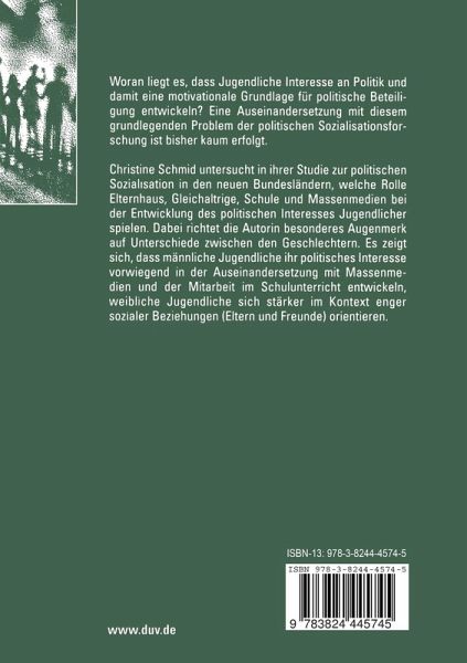 Christine Schmid untersucht in ihrer Studie zur politischen Sozialisation in den neuen Bundesländern, welche Rolle Elternhaus, Gleichaltrige, Schule und Massenmedien bei der Entwicklung des politischen Interesses Jugendlicher spielen. Dabei richtet die Autorin besonderes Augenmerk auf Unterschiede zwischen den Geschlechtern. Es zeigt sich, dass männliche Jugendliche ihr politisches Interesse vorwiegend in der Auseinandersetzung mit Massenmedien und der Mitarbeit im Schulunterricht entwickeln, weibliche Jugendliche sich stärker im Kontext enger sozialer Beziehungen (Eltern und Freunde) orientieren.
