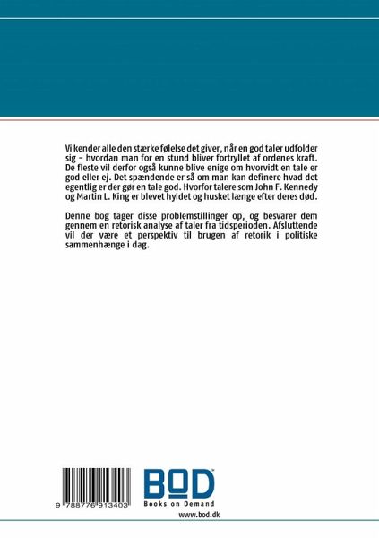 Vi kender alle den stærke følelse det giver, når en god taler udfolder sig - Hvordan man for en stund bliver fortryllet af ordenes kraft. De fleste vil derfor også kunne blive enige om hvorvidt en tale er god eller ej. Det spændende er så om man kan definere hvad det egentlig er der gør en tale god. Hvorfor talere som John F. Kennedy og Martin L. King er blevet hyldet og husket længe efter deres død. Denne bog tager disse problemstillinger op, og besvarer dem gennem en retorisk analyse af taler fra tidsperioden. Afsluttende vil der være et perspektiv til brugen af retorik i politiske sammenhænge i dag.