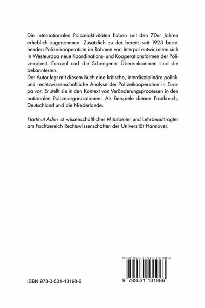 Die internationalen Polizeiaktivitäten haben seit den 70er Jahren erheblich zugenommen. Zusätzlich zu der bereits seit 1923 bestehenden Polizeikooperation im Rahmen von Interpol entwickelten sich in Westeuropa neue Koordinations- und Kooperationsformen der Polizeiarbeit. Europol und die Schengener Übereinkommen sind die bekanntesten. Der Autor legt mit diesem Buch eine kritische, interdisziplinäre politik- und rechtswissenschaftliche Analyse der Polizeikooperation in Europa vor. Er stellt sie in den Kontext von Veränderungsprozessen in den nationalen Polizeiorganisationen. Als Beispiele dienen Frankreich, Deutschland und die Niederlande.