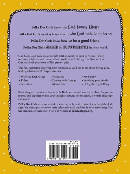 God has blessed each one of us with relationships! He gives us friends, family, teachers, neighbors and tons of other people to walk through our lives with us. Our relationships are one of His greatest gifts.But let's be really honest. Our relationships are one of our greatest blessings, but they can also be one of our biggest problems! We can have fights with our friends. Our brothers can pick on us. We can get frustrated with our parents. Our teachers can make us mad and our neighbors can hurt our feelings.God knows how important your relationships are to you, and so He wants to help you with them! The Bible is full of instructions to help us work out all the problems in our relationships.This fun, interactive study will help you learn all God has to say about having good, healthy relationships! Chapters include:We Need Each Other Friendship My Family Elders Dealing with Change Watching your Words Attention Mean Girls And Doing the Right Thing Each chapter contains a lesson with Bible verses and stories, a place for you to journal and dig deeper into your thoughts, activity sheets, crafts, a weekly challenge and more!