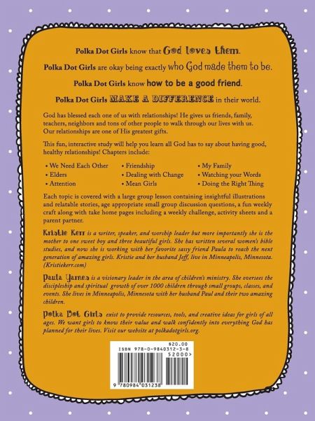 God has blessed each one of us with relationships! He gives us friends, family, teachers, neighbors and tons of other people to walk through our lives with us. Our relationships are one of His greatest gifts. This fun, interactive study will help you learn all God has to say about having good, healthy relationships! Chapters include: We Need Each Other Friendship,My Family,Dealing with Change,Watching your Words,Attention,Mean Girls And Doing the Right Thing, Each topic is covered with a large group lesson containing insightful illustrations and relatable stories, age appropriate small group discussion questions, a fun weekly craft along with take home pages including a weekly challenge, activity sheets and a parent partner.