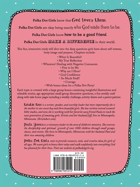 This fun, interactive study will dive into the deep questions girls have about self-esteem, body image and purpose. Chapters include:What Is Beautiful? My True Reflection /Whatever! Dealing with negative comments,Why am I Here?God Confidence, So Much Stuff! and Courage. With bonus ideas for a Polka Dot Party for your girls! Each topic is covered with a large group lesson containing insightful illustrations and relatable stories, age appropriate small group discussion questions, a fun weekly craft along with take home pages including a weekly challenge, activity sheets and a parent partner.