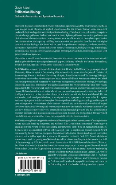 This book has a wider approach not strictly focused on crop production compared to other books that are strictly oriented towards bees, but has a generalist approach to pollination biology. It also highlights relationships between introduced and wild pollinators and consequences of such introductions on communities of wild pollinating insects. The chapters on biochemical basis of plant-pollination interaction, pollination energetics, climate change and pollinators and pollinators as bioindicators of ecosystem functioning provide a base for future insights into pollination biology. The role of honeybees and wild bees on crop pollination, value of bee pollination, planned honeybee pollination, non-bee pollinators, safety of pollinators, pollination in cages, pollination for hybrid seed production, the problem of diseases, genetically modified plants and bees, the role of bees in improving food security and livelihoods, capacity building and awareness for pollinators are also discussed.