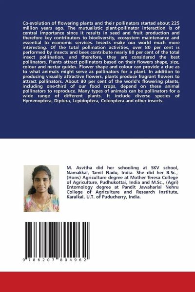 Co-evolution of flowering plants and their pollinators started about 225 million years ago. The mutualistic plant-pollinator interaction is of central importance since it results in seed and fruit production and therefore key contributors to biodiversity, ecosystem maintenance and essential to economic services. Insects make our world much more interesting. Of the total pollination activities, over 80 per cent is performed by insects and bees contribute nearly 80 per cent of the total insect pollination, and therefore, they are considered the best pollinators. Plants attract pollinators based on their flowers shape, size, colour and nectar guides. Flower shape and colour can provide a clue as to what animals might serve as pollinators for a plant. In addition to producing visually attractive flowers, plants produce fragrant flowers to attract pollinators. About 80 per cent of the world's flowering plants, including one-third of our food crops, depend on these animal pollinators to reproduce. Many types of animals can be pollinators for a wide range of different plants. It include diverse species of Hymenoptera, Diptera, Lepidoptera, Coleoptera and other insects.