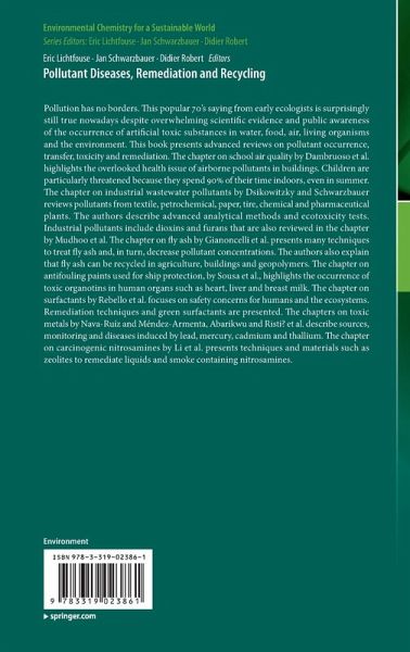 Pollution has no borders. This popular 70's saying from early ecologists is surprisingly still true nowadays despite overwhelming scientific evidence and public awareness of the occurrence of artificial toxic substances in water, food, air, living organisms and the environment. This book presents advanced reviews on pollutant occurrence, transfer, toxicity and remediation. The chapter on school air quality by Dambruoso et al. highlights the overlooked health issue of airborne pollutants in buildings. Children are particularly threatened because they spend 90% of their time indoors, even in summer. The chapter on industrial wastewater pollutants by Dsikowitzky and Schwarzbauer reviews pollutants from textile, petrochemical, paper, tire, chemical and pharmaceutical plants. The authors describe advanced analytical methods and ecotoxicity tests. Industrial pollutants include dioxins and furans that are also reviewed in the chapter by Mudhoo et al. The chapter on fly ash by Gianoncelli et al. presents many techniques to treat fly ash and, in turn, decrease pollutant concentrations. The authors also explain that fly ash can be recycled in agriculture, buildings and geopolymers. The chapter on antifouling paints used for ship protection, by Sousa et al., highlights the occurrence of toxic organotins in human organs such as heart, liver and breast milk. The chapter on surfactants by Rebello et al. focuses on safety concerns for humans and the ecosystems. Remediation techniques and green surfactants are presented. The chapters on toxic metals by Nava-Ruíz and Méndez-Armenta, Abarikwu and Ristic et al. describe sources, monitoring and diseases induced by lead, mercury, cadmium and thallium. The chapter on carcinogenic nitrosamines by Li et al. presents techniques and materials such as zeolites to remediate liquids and smoke containing nitrosamines.