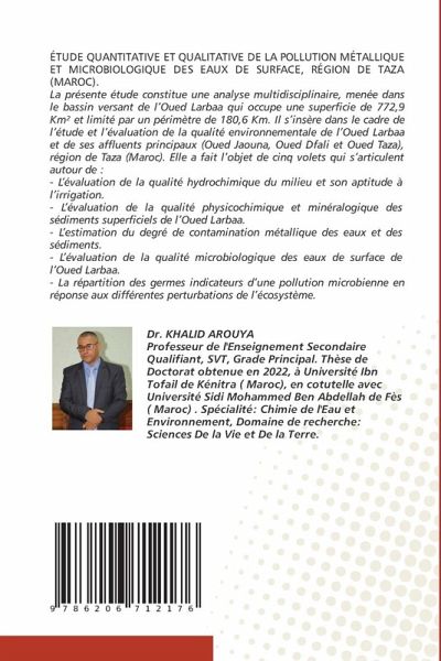 ÉTUDE QUANTITATIVE ET QUALITATIVE DE LA POLLUTION MÉTALLIQUE ET MICROBIOLOGIQUE DES EAUX DE SURFACE, RÉGION DE TAZA (MAROC).La présente étude constitue une analyse multidisciplinaire, menée dans le bassin versant de l'Oued Larbaa qui occupe une superficie de 772,9 Km² et limité par un périmètre de 180,6 Km. Il s'insère dans le cadre de l'étude et l'évaluation de la qualité environnementale de l'Oued Larbaa et de ses affluents principaux (Oued Jaouna, Oued Dfali et Oued Taza), région de Taza (Maroc). Elle a fait l'objet de cinq volets qui s'articulent autour de :- L'évaluation de la qualité hydrochimique du milieu et son aptitude à l'irrigation.- L'évaluation de la qualité physicochimique et minéralogique des sédiments superficiels de l'Oued Larbaa.- L'estimation du degré de contamination métallique des eaux et des sédiments.- L'évaluation de la qualité microbiologique des eaux de surface de l'Oued Larbaa. - La répartition des germes indicateurs d'une pollution microbienne en réponse aux différentes perturbations de l'écosystème.