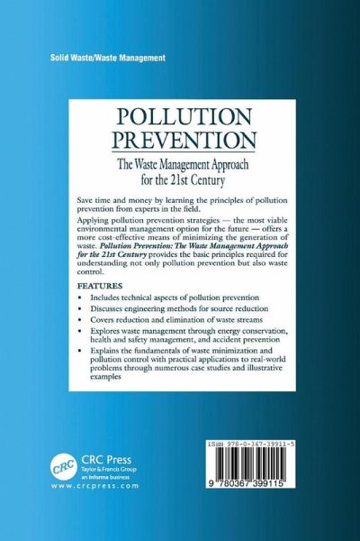 Applying pollution prevention strategies - the most viable environmental management option of the future - offers a cost-effective means of minimizing waste. Pollution Prevention: The Waste Management Approach to the 21st Century provides the background needed to understand not only pollution prevention but also waste control. Thorough, clear, and concise, it explains the fundamentals of pollution prevention and their applications to real-world problems. It explores pollution prevention through energy conservation, health and safety management, and accident prevention. The authors include illustrative examples and case studies that demonstrate the solutions offered.