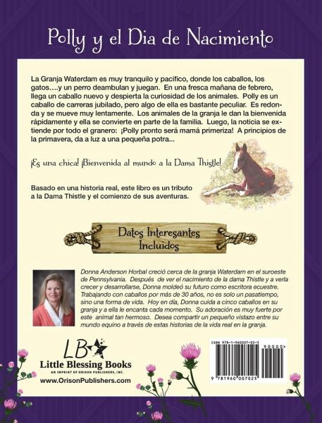 La Granja Waterdam es muy tranquilo y pacifico, donde los caballos, los gatos....y un perro deambulan y juegan. En una fresca mañana de febrero, llega un caballo nuevo y despierta la curiosidad de los animales. Polly es un caballo de carreras jubilado, pero algo de ella es bastante peculiar. Es redonda y se mueve muy lentamente. Los animales de la granja le dan la bienvenida rápidamente y ella se convierte en parte de la familia. Luego, la noticia se extiende por todo el granero: ¡Polly pronto será mamá primeriza! A principios de la primavera, da a luz a una pequeña potra...... ¡Es una chica! ¡Bienvenida al mundo a la Dama Thistle! Basado en una historia real, este libro es un tributo a la Dama Thistle y el comienzo de sus aventuras.