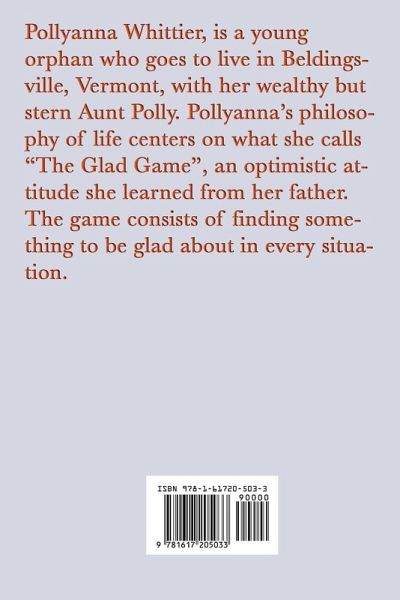 Pollyanna Whittier, is a young orphan who goes to live in Beldingsville, Vermont, with her wealthy but stern Aunt Polly. Pollyanna's philosophy of life centers on what she calls "The Glad Game", an optimistic attitude she learned from her father. The game consists of finding something to be glad about in every situation.