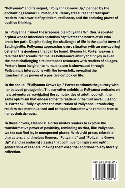 "Pollyanna" and its sequel, "Pollyanna Grows Up," penned by the enchanting Eleanor H. Porter, are literary treasures that transport readers into a world of optimism, resilience, and the enduring power of positive thinking. In "Pollyanna," meet the irrepressible Pollyanna Whittier, a spirited orphan whose infectious optimism captivates the hearts of all who cross her path. Despite facing the challenges of life in the quaint town of Beldingsville, Pollyanna approaches every situation with an unwavering belief in the goodness that can be found. Eleanor H. Porter weaves a tale that transcends its time, as Pollyanna's ability to find joy in even the most challenging circumstances resonates with readers of all ages. Porter's keen insight into human nature is showcased through Pollyanna's interactions with the townsfolk, revealing the transformative power of a positive outlook on life. As the story unfolds, readers witness the ripple effects of Pollyanna's infectious spirit, challenging preconceived notions and transforming the lives of those around her. The novel is a celebration of the indomitable human spirit and a reminder that even in the face of adversity, a hopeful heart can lead to unexpected joys. In the sequel, "Pollyanna Grows Up," Porter continues the journey with her beloved protagonist. The narrative unfolds as Pollyanna embarks on new adventures, navigating the complexities of adulthood with the same optimism that endeared her to readers in the first novel. Eleanor H. Porter skillfully explores the maturation of Pollyanna, introducing readers to a more nuanced and complex character who remains true to her optimistic roots. "Pollyanna Grows Up" delves into the challenges and joys of growing older, maintaining the charm of the original while introducing a fresh perspective on life's intricacies. Porter's storytelling prowess shines as she crafts a narrative that is both heartwarming and thought-provoking, inviting readers to reflect on their own journeys of personal growth. What makes both novels timeless is Porter's ability to infuse her characters with authenticity and depth, allowing readers to connect with the stories on a profoundly emotional level. The Beldingsville community becomes a character in itself, providing the backdrop for the unfolding drama of life, love, and self-discovery. In these novels, Eleanor H. Porter invites readers to explore the transformative power of positivity, reminding us that, like Pollyanna, we too can find joy in unexpected places. With vivid prose, relatable characters, and timeless themes, "Pollyanna" and "Pollyanna Grows Up" stand as enduring classics that continue to inspire and uplift generations of readers, making them essential additions to any literary collection.