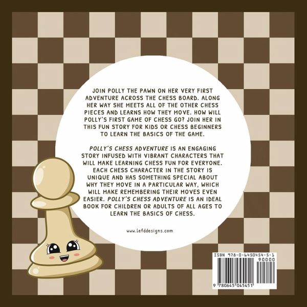 Polly's Chess Adventure - A Fun Book for Kids to Learn How to Play Chess Through Polly the Pawn's Adventures! Join Polly the Pawn on her very first adventure across the chess board. Along her way she meets all the other chess pieces on the board and learns how they move. How will Polly's first game of chess go? Join her in this fun story for kids or chess beginners to learn the basics of the game. Polly's Chess Adventure is an engaging story infused with vibrant characters that will make learning chess fun for everyone. Each chess character in the story is unique and has something special about why they move in a particular way, which will make remembering their moves even easier. Polly's Chess Adventure is an ideal book for children or adults of all ages to learn the basics of chess. It is the perfect gift for chess beginners or chess lovers! Available in both paperback and hardcover (8.5 x 8.5 inch). Polly's Chess Adventure is published by LEFD Designs. See more at, www.lefddesigns.com