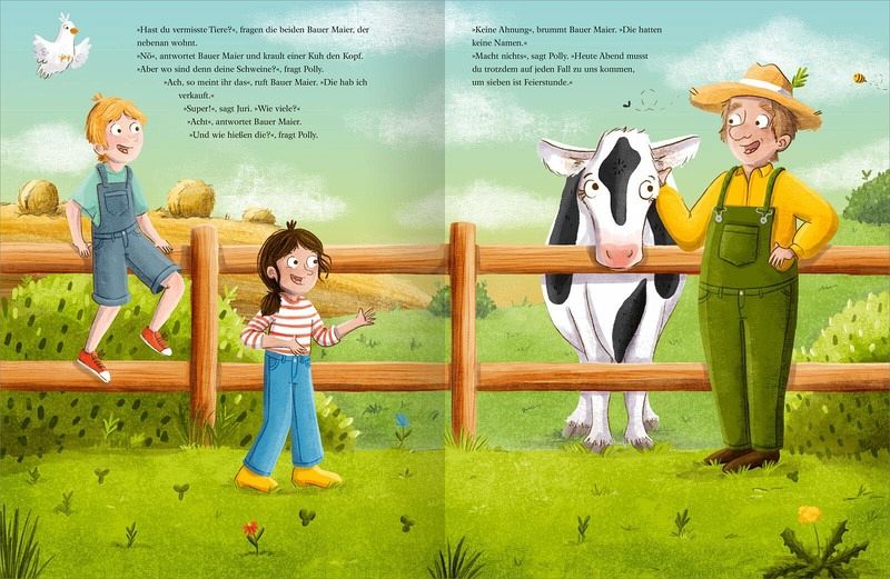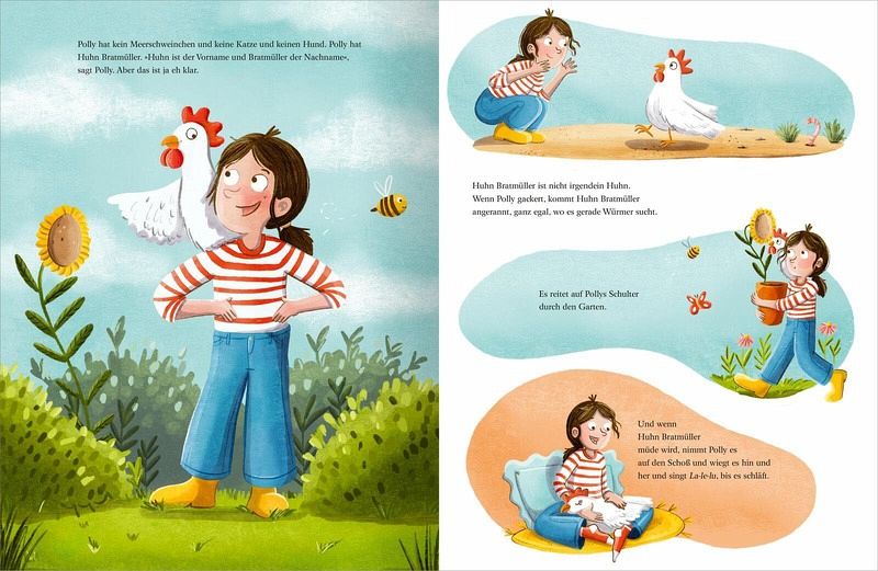 Polly hat kein Meerschweinchen und keine Katze und keinen Hund. Polly hat ein Huhn. Wenn Polly gackert, kommt Huhn Bratmüller angerannt, ganz egal, wo es gerade Würmer sucht. Es reitet auf Pollys Schultern durch den Garten, und wenn Huhn Bratmüller müde wird, nimmt Polly es auf den Schoß und wiegt es hin und her.