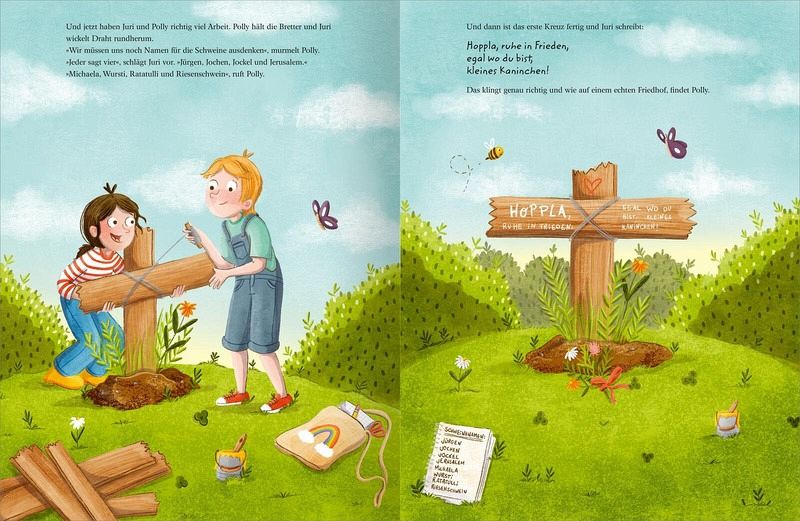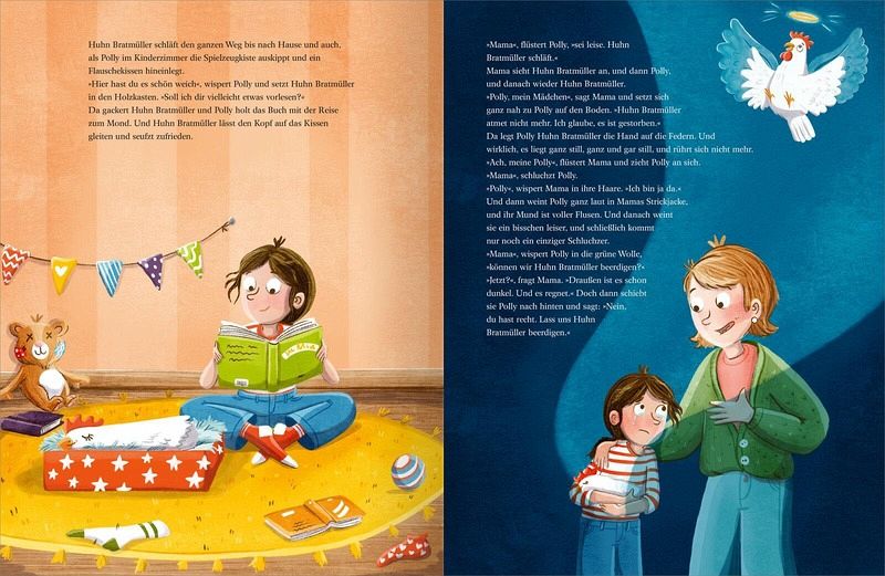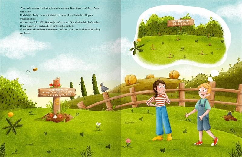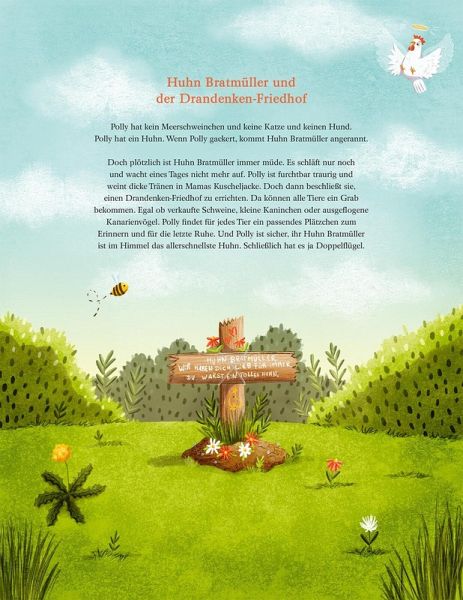 Doch plötzlich geht es Huhn Bratmüller nicht mehr gut. Es ist sehr müde und dann wacht es eines Tages nicht mehr auf. Polly ist furchtbar traurig und weint dicke Tränen in Mamas Kuschelpullover. Und dann beschließt sie, einen Drandenken-Friedhof zu errichten, direkt im Garten. Da können alle Tiere ein Grab bekommen. Egal ob verkaufte Schweine, kleine Kaninchen oder ausgeflogene Kanarienvögel. Polly findet für jedes Tier ein passendes Plätzchen zum Erinnern und für die letzte Ruhe. Und Polly ist sicher, ihr Huhn Bratmüller ist im Himmel das allerschnellste Huhn. Schließlich hat es ja Doppelflügel.