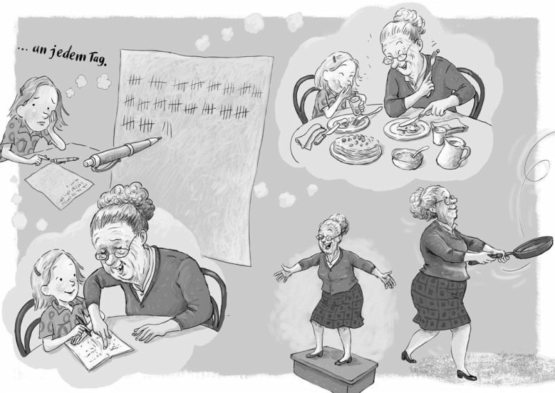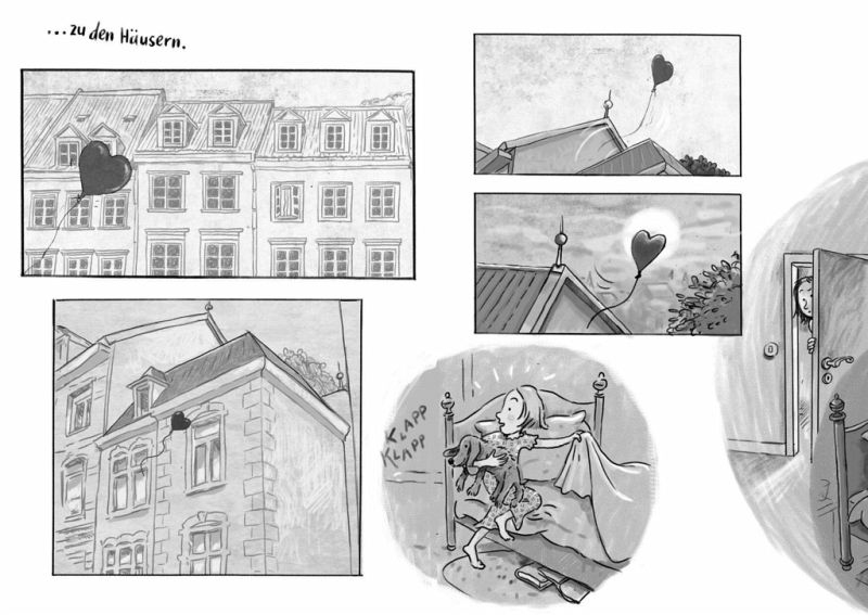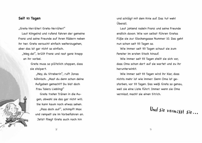 Das Buch beginnt mit Pollys Brief, den sie am Schreibtisch sitzend an die tote Oma schreibt. Sie erinnert sich darin an gemeinsame Ereignisse und hofft, dass der Brief mit dem Luftballon die Oma im Himmel erreicht. Nach dem ersten Kapitel, in dem der Luftballon wegfliegt, sehen wir eine kleine Bildergeschichte, die uns die Szene zeigt. 93 Tage ist Oma nicht mehr da und Polly vermisst sie so sehr. Die Bilder zeigen die beiden bei fröhlichen gemeinsamen Aktionen, wie Pfannkuchen backen. Auf ihrem Nachhauseweg geht Polly nochmal zu den Geschäften, in denen sie immer mit Oma eingekauft hat. Obwohl die Geschäftsleute ihr anbieten ihr etwas zu schenken, lehnt Polly ab. Auf den Bildern sehen wir Oma fast durchsichtig und mit Flügeln hinter Polly. Doch dann findet Polly zu Hause in der Post eine Antwort von Oma und sie fordert Polly auf ihr weiterhin zu schreiben und die Briefe in der alten Eiche zu deponieren.