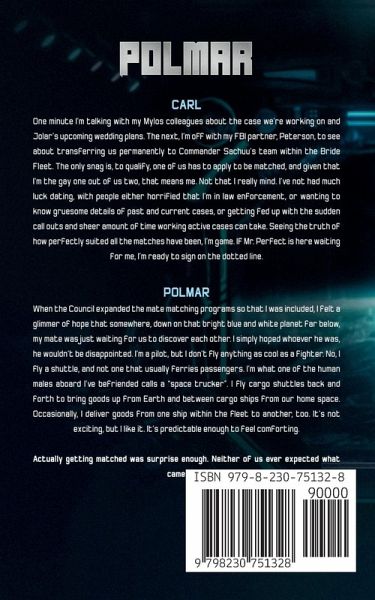 Carl One minute I'm talking with my Mylos colleagues about the case we're working on and Jolar's upcoming wedding plans. The next, I'm off with my FBI partner, Peterson, to see about transferring us permanently to Commander Sachuu's team within the Bride Fleet. The only snag is, to qualify, one of us has to apply to be matched, and given that I'm the gay one out of us two, that means me. Not that I really mind. I've not had much luck dating, with people either horrified that I'm in law enforcement, or wanting to know gruesome details of past and current cases, or getting fed up with the sudden call outs and sheer amount of time working active cases can take. Seeing the truth of how perfectly suited all the matches have been, I'm game. If Mr. Perfect truly is here waiting for me, I'm ready to sign on the dotted line. Polmar When the Council expanded the mate matching programs so that I was included, I felt a glimmer of hope that somewhere, down on that bright blue and white planet far below, my mate was just waiting for us to discover each other. I just hoped whoever he was, he wouldn't be disappointed. I'm a pilot, but I don't fly anything as cool as a fighter. No, I fly a shuttle and not one that usually ferries passengers. I'm what one of the human males aboard I've befriended calls a 'space trucker'. That is, I fly cargo shuttles back and forth to bring goods up from Earth and between cargo ships from our home space. Occasionally, I deliver goods from one ship within the fleet to another too. It's not exciting, but I like it. It's predictable enough to feel comforting. Actually getting matched was surprise enough. Neither of us ever expected what came next.