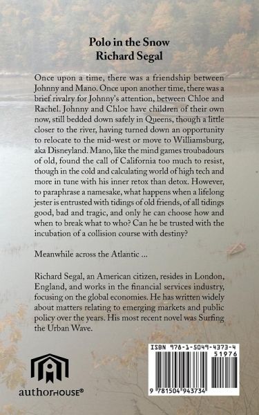 Polo in the Snow Richard Segal Once upon a time, there was a friendship between Johnny and Mano. Once upon another time, there was a brief rivalry for Johnny's attention, between Chloe and Rachel. Johnny and Chloe have children of their own now, still bedded down safely in Queens, though a little closer to the river, having turned down an opportunity to relocate to the mid-west or move to Williamsburg, aka Disneyland. Mano, like the mind games troubadours of old, found the call of California too much to resist, though in the cold and calculating world of high tech and more in tune with his inner retox than detox. However, to paraphrase a namesake, what happens when a lifelong jester is entrusted with tidings of old friends, of all tidings good, bad and tragic, and only he can choose how and when to break what to who? Can he be trusted with the incubation of a collision course with destiny? Meanwhile across the Atlantic ...
