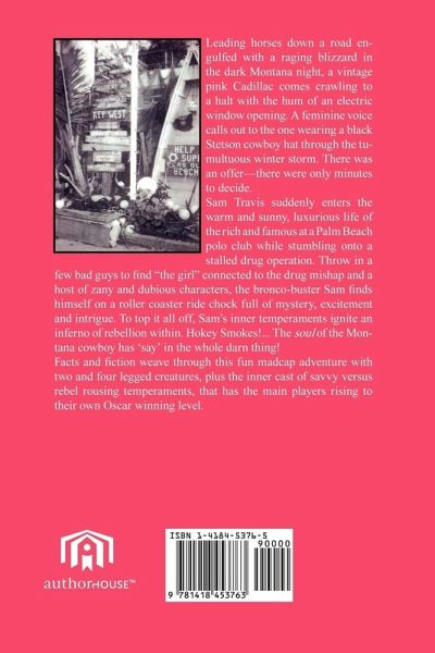 Leading horses down a road engulfed with a raging blizzard in the dark Montana night, a vintage pink Cadillac comes crawling to a halt with the hum of an electric window opening. A feminine voice calls out to the one wearing a black Stetson cowboy hat through the tumulus winter storm. There was an offer-there were only minutes to decide. Gill Travis suddenly enters the warm and sunny, luxurious life of the rich and famous at a Palm Beach polo club while stumbling onto a stalled drug operation. Throw in a few bad guys to find "the girl" connected to the drug mishap and a host of zany and dubious characters, the bronco-buster Gill finds himself on a roller coaster ride chock full of mystery, excitement and intrigue. To top it all off, Gill's inner temperaments ignite an inferno of rebellion within. Hokey Smokes!... The soul of the Montana cowboy has 'say' in the whole darn thing! Based on real happenings, this fun madcap adventure with two and four legged creatures, plus the inner cast of savvy versus rebel rousing temperaments, has the main players rising to their own Oscar winning level.
