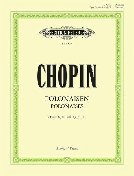 A collection of 10 Chopin Polonaises for solo piano. Includes the 'Military' Polonaise in A (Op. 40 No. 1), and the "Heroic" Polonaise in A? (Op. 53) arguably some of his most well known polonaises. Die Sammlung enthält 10 Polonaisen von Chopin für Klavier, darunter die "Militärische" in A-Dur op. 40 Nr. 1 und die "Heroische" in As-Dur op. 53, die zu seinen bekanntesten Polonaisen gehören.