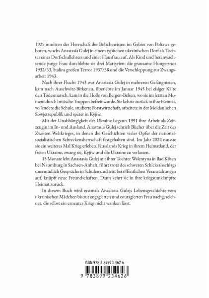 Vorwort zur zweiten Auflage 7 Ein Wort zuvor 9 Eine Überlebende erzählt 17 Eine Kindheit zwischen Holodomor und Großem Terror 19 1941 - Der Krieg kommt in mein Leben 53 Zwangsarbeit - Gefangene der Deutschen 65 Gefangenschaft in Rzeszów und Tarnow 87 Auschwitz-Birkenau 93 Im Landwirtschaftskommando in Budy 119 Todesmarsch 137 In der Hölle - Bergen-Belsen 145 Die Errettung 165 Der Weg nach Hause 173 Wieder zuhause. Schule und Studium 183 Moldawien und Kyjiw 195 "Ich habe überlebt, um euch davon berichten zu können." Eine Zeitzeugin erzählt 211 Wieder Krieg 241 Maik Reichel: Der 24. Februar 2022 243 Anastasia Gulej: Flucht aus Kyjiw im März 2022 247 "In Sicherheit bei meinen deutschen Freunden." Als Flüchtling in Deutschland 253 Wegbegleiter erinnern sich 281 Kindheit in vollkommener Freiheit Walentyna Gulej im Gespräch mit Maik Reichel 283 Ljuba Danylenko: Das Leben lieben 293 Tetiana Pastuschenko: Es ist nie zu spät, etwas zu ändern ... 294 Peter Wetzel: Sie berührt die Menschen. 297 Cornelia Habisch: Schule ohne Rassismus - Schule mit Courage 299 Diana Gring: Anastasia Gulej und der Ort Bergen-Belsen 301 Kai Langer: Stets erhobenen Hauptes 308 Danuta Teresa Konieczny: "Ich habe einen Traum ..." 312 Jacqueline Kreisel und Thomas Leistner: Wir denken voller Dankbarkeit an die schöne gemeinsame Zeit 317 Jana Birkenhagen und Sylvia Cecaric: Zur richtigen Zeit am richtigen Ort 320 Uwe Maul: "Anastasia ist eine starke Frau!" 323 Historische Einordnung 327 Veronika Weisheimer: Die Ukrainische Revolution 1917-1920 328 Kai Langer: Historisches Umfeld 332 Ljuba Danylenko: Entschädigung oder eine humanitäre Geste 343 Russlands Krieg gegen die Ukraine 2022 347 Ljuba Danylenko: Tagebuch 349 Tetiana Pastuschenko: Die Zerstörung einer Weltordnung 361 Borys Romantschenko 364 Andrii Portnov: Eine Geschichtsstunde von Putin. Und für Putin 366 Die Nationalhymne der Ukraine 375 Dank 377 Bildnachweis 379 Impressum 380