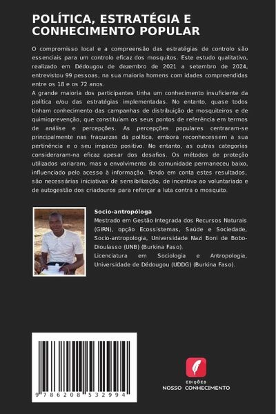 O compromisso local e a compreensão das estratégias de controlo são essenciais para um controlo eficaz dos mosquitos. Este estudo qualitativo, realizado em Dédougou de dezembro de 2021 a setembro de 2024, entrevistou 99 pessoas, na sua maioria homens com idades compreendidas entre os 18 e os 72 anos.A grande maioria dos participantes tinha um conhecimento insuficiente da política e/ou das estratégias implementadas. No entanto, quase todos tinham conhecimento das campanhas de distribuição de mosquiteiros e de quimioprevenção, que constituíam os seus pontos de referência em termos de análise e percepções. As percepções populares centraram-se principalmente nas fraquezas da política, embora reconhecessem a sua pertinência e o seu impacto positivo. No entanto, as outras categorias consideraram-na eficaz apesar dos desafios. Os métodos de proteção utilizados variaram, mas o envolvimento da comunidade permaneceu baixo, influenciado pelo acesso à informação. Tendo em conta estes resultados, são necessárias iniciativas de sensibilização, de incentivo ao voluntariado e de autogestão dos criadouros para reforçar a luta contra o mosquito.