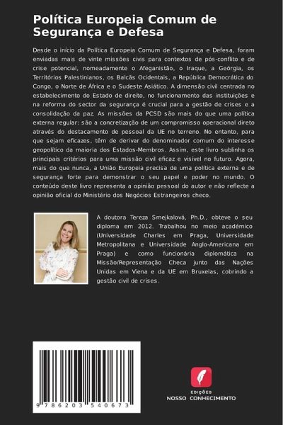 Desde o início da Política Europeia Comum de Segurança e Defesa, foram enviadas mais de vinte missões civis para contextos de pós-conflito e de crise potencial, nomeadamente o Afeganistão, o Iraque, a Geórgia, os Territórios Palestinianos, os Balcãs Ocidentais, a República Democrática do Congo, o Norte de África e o Sudeste Asiático. A dimensão civil centrada no estabelecimento do Estado de direito, no funcionamento das instituições e na reforma do sector da segurança é crucial para a gestão de crises e a consolidação da paz. As missões da PCSD são mais do que uma política externa regular: são a concretização de um compromisso operacional direto através do destacamento de pessoal da UE no terreno. No entanto, para que sejam eficazes, têm de derivar do denominador comum do interesse geopolítico da maioria dos Estados-Membros. Assim, este livro sublinha os principais critérios para uma missão civil eficaz e visível no futuro. Agora, mais do que nunca, a União Europeia precisa de uma política externa e de segurança forte para demonstrar o seu papel e poder no mundo. O conteúdo deste livro representa a opinião pessoal do autor e não reflecte a opinião oficial do Ministério dos Negócios Estrangeiros checo.