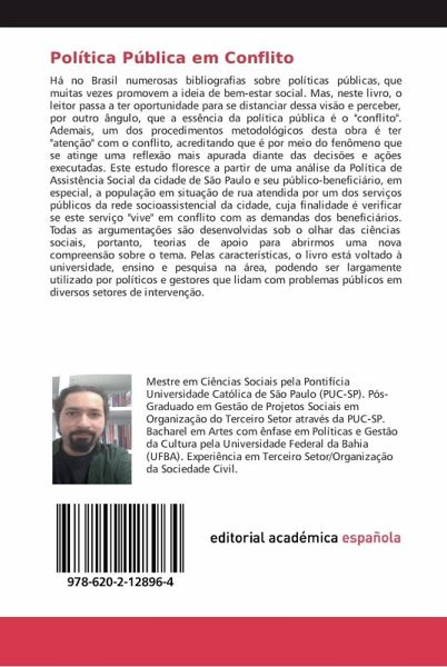 Há no Brasil numerosas bibliografias sobre políticas públicas, que muitas vezes promovem a ideia de bem-estar social. Mas, neste livro, o leitor passa a ter oportunidade para se distanciar dessa visão e perceber, por outro ângulo, que a essência da política pública é o "conflito". Ademais, um dos procedimentos metodológicos desta obra é ter "atenção" com o conflito, acreditando que é por meio do fenômeno que se atinge uma reflexão mais apurada diante das decisões e ações executadas. Este estudo floresce a partir de uma análise da Política de Assistência Social da cidade de São Paulo e seu público-beneficiário, em especial, a população em situação de rua atendida por um dos serviços públicos da rede socioassistencial da cidade, cuja finalidade é verificar se este serviço "vive" em conflito com as demandas dos beneficiários. Todas as argumentações são desenvolvidas sob o olhar das ciências sociais, portanto, teorias de apoio para abrirmos uma nova compreensão sobre o tema. Pelas características, o livro está voltado à universidade, ensino e pesquisa na área, podendo ser largamente utilizado por políticos e gestores que lidam com problemas públicos em diversos setores de intervenção.