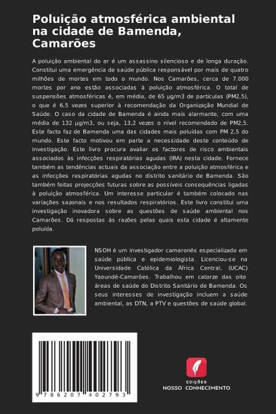 A poluição ambiental do ar é um assassino silencioso e de longa duração. Constitui uma emergência de saúde pública responsável por mais de quatro milhões de mortes em todo o mundo. Nos Camarões, cerca de 7.000 mortes por ano estão associadas à poluição atmosférica. O total de suspensões atmosféricas é, em média, de 65 μg/m3 de partículas (PM2,5), o que é 6,5 vezes superior à recomendação da Organização Mundial de Saúde. O caso da cidade de Bamenda é ainda mais alarmante, com uma média de 132 μg/m3, ou seja, 13,2 vezes o nível recomendado de PM2,5. Este facto faz de Bamenda uma das cidades mais poluídas com PM 2,5 do mundo. Este facto motivou em parte a necessidade deste conteúdo de investigação. Este livro procura avaliar os factores de risco ambientais associados às infecções respiratórias agudas (IRA) nesta cidade. Fornece também as tendências actuais da associação entre a poluição atmosférica e as infecções respiratórias agudas no distrito sanitário de Bamenda. São também feitas projecções futuras sobre as possíveis consequências ligadas à poluição atmosférica. Um interesse particular é também colocado nas variações sazonais e nos resultados respiratórios. Este livro constitui uma investigação inovadora sobre as questões de saúde ambiental nos Camarões. Dá respostas às razões pelas quais esta cidade é altamente poluída.