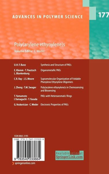 U.H.F. Bunz: Synthesis and Structure of PAEs.- E. Klemm, T. Pautzsch, L. Blankenburg: Organometallic PAEs.- C.R. Ray, J.S. Moore: Supramolecular Organization of Foldable Phenylene Ethynylene Oligomers.- J. Zheng, T.M. Swager: Poly(arylene ethynylene)s in Chemosensing and Biosensing.- T. Yamamoto, I. Yamaguchi, T. Yasuda: PAEs with Heteroaromatic Rings.- G. Voskerician, C. Weder: Electronic Properties of PAEs.