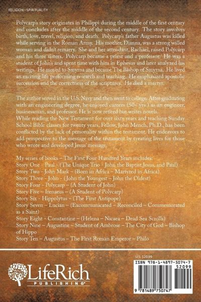 Polycarp's story originates in Philippi during the middle of the first century and concludes after the middle of the second century. The story involves birth, love, travel, religion, and death. Polycarp's father Augustus was killed while serving in the Roman Army. His mother, Dianna, was a strong willed woman and didn't remarry. She and her attendant, Rachael, raised Polycarp and his three sisters. Polycarp became a priest and a professor. He was a student of John's and spent time with him in Ephesus and later analyzed his writings. He moved to Smyrna and became The Bishop of Smyrna. He lived an exciting life performing research and teaching. He emphasized apostolic succession and the correctness of the scriptures. He died a martyr.