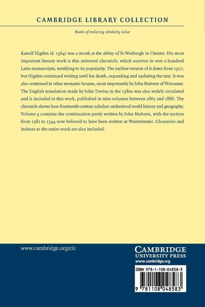 Ranulf Higden (d.1364) was a monk at the abbey of St Werburgh in Chester. His most important literary work is this universal chronicle, which survives in over a hundred Latin manuscripts, testifying to its popularity. The earliest version of it dates from 1327, but Higden continued writing until his death, expanding and updating the text. It was also continued in other monastic houses, most importantly by John Malvern of Worcester. The English translation made by John Trevisa in the 1380s was also widely circulated and is included in this work, published in nine volumes between 1865 and 1886. The chronicle shows how fourteenth-century scholars understood world history and geography. Volume 9 contains the continuation partly written by John Malvern, with the section from 1381 to 1394 now believed to have been written at Westminster. Glossaries and indexes to the entire work are also included.