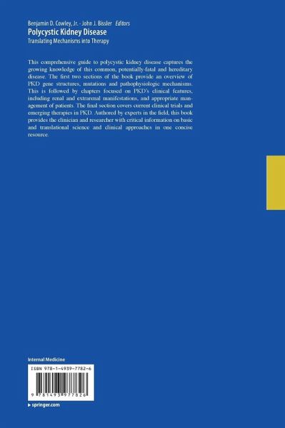 PART 1. POLYCYSTIC KIDNEY DISEASE GENES & PROTEINS.- 1. Classical Polycystic Kidney Disease (PKD): Gene Structures and Mutations and Protein Structures and Functions.- 2. Bardet-Biedl Syndrome.- 3. Cystic Kidney Diseases Associated with Increased Cancer Risk: Tuberous Sclerosis Complex, Von Hippel Lindau, and Birt Hogg Dubé.- PART 2. POLYCYCSTIC KIDNEY DISEASE: MECHANISMS OF DISEASE.- 4. Aberrant Cellular Pathways in PKD.- 5. Cilia and Polycystic Kidney Disease.- 6. The Role of Inflammation and Fibrosis in Cystic Kidney Disease.- PART 3. CLINICAL FEATURES.- 7. Imaging-based Diagnosis of Autosomal Dominant Polycystic Kidney Disease.- 8. Renal Structural Involvement in Autosomal Dominant Polycystic Kidney Disease: Cyst Growth and Total Kidney Volume: Lessons from the Consortium for Radiologic Imaging of Polycystic Kidney Disease (CRISP).- 9. Renal Complications: Pain, Infection and Nephrolithiasis.- 10. ADPKD Extrarenal Manifestations: Polycystic Liver Disease.- 11. Extrarenal Manifestations of Autosomal Dominant Polycystic Kidney Disease.- PART 4. CLINICAL TRIALS AND EMERGING THERAPIES.- 12. Role of Renin- Angiotensin- Aldosterone System Inhibition in Autosomal Dominant Polycystic Kidney Disease.- 13. Vasopressin Receptor Antagonism.- 14. End-stage Renal Disease in Patients with Autosomal Dominant Polycystic Kidney Disease.- 15. Polycystic Kidney Disease: Translating Mechanisms into Therapy Management of ADPKD Today.