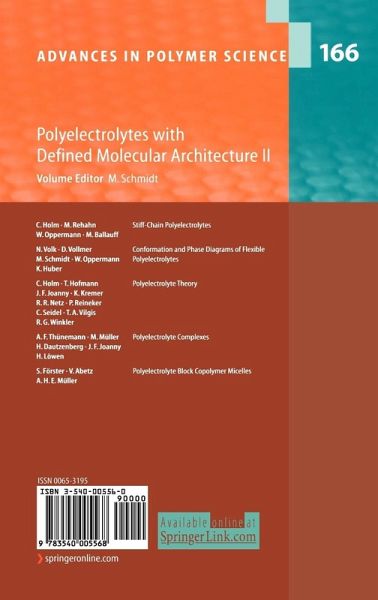 The two volumes 165 and 166 Polyelectrolytes with Defined Molecular Architecture summarize recent progress in the field. The subjects comprise novel polyelectrolyte architectures including planar, cylindrical and spherical polyelectrolyte brushes as well as micelle, complex and membrane formation. Some solution properties such as conformation of flexible polyions, osmotic coefficients and electrophoretic properties are addressed along with recent progress in analytical theory and simulation.