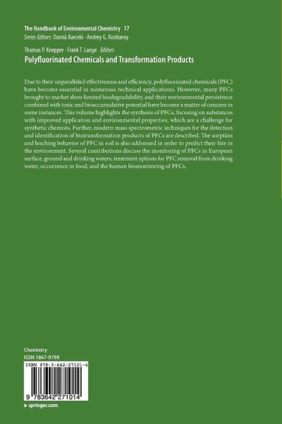 Due to their unparalleled effectiveness and efficiency, polyfluorinated chemicals (PFC ) have become essential in numerous technical applications. However, many PFCs brought to market show limited biodegradability, and their environmental persistence combined with toxic and bioaccumulative potential have become a matter of concern in some instances. This volume highlights the synthesis of PFCs, focusing on substances with improved application and environmental properties, which are a challenge for synthetic chemists. Further, modern mass spectrometric techniques for the detection and identification of biotransformation products of PFCs are described. The sorption and leaching behavior of PFC in soil is also addressed in order to predict their fate in the environment. Several contributions discuss the monitoring of PFCs in European surface, ground and drinking waters, treatment options for PFC removal from drinking water, occurrence in food, and the human biomonitoring of PFCs.