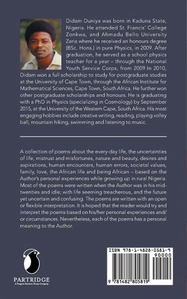 A collection of poems about the every-day life, the uncertainties of life, mistrust and misfortunes, nature and beauty, desires and aspirations, human encounters, human errors, societal values, family, love, the African life and being African - based on the Author's personal experiences while growing up in rural Nigeria. Most of the poems were written when the Author was in his mid-twenties and idle; with life seeming treacherous, and the future yet uncertain and confusing. The poems are written with an open or flexible interpretation. It is hoped that the reader would try and interpret the poems based on his/her personal experiences and/or circumstances. Nevertheless, each of the poems has a personal meaning to the Author.