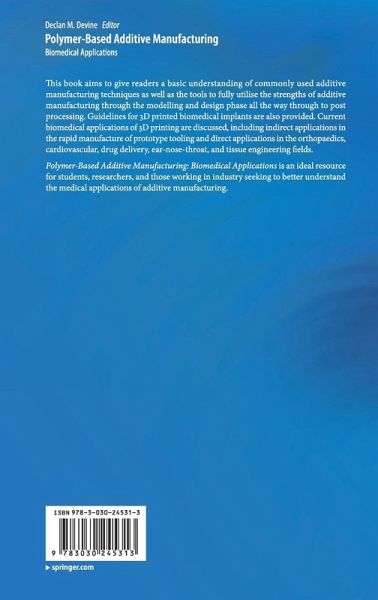 Chapter 1: Polymer based additive manufacturing: historical developments, process types and material considerations.- Chapter 2: Design for Additive Manufacturing.- Chapter 3: Mechanics Modeling of Additive Manufactured Polymers.- Chapter 4: Additive Manufactured Tooling for use in Mass Production Processes.- Chapter 5: Current market for biomedical implants.- Chapter 6: Orthopedic 3D Printing in Orthopedic Medicine.- Chapter 7: Customised Interventions Utilising Additive Manufacturing.- Chapter 8: 3D Bioprinting Hardware.- Chapter 9: BioInks and their applications in tissue engineering.- Chapter 10: Post-Processing Considerations for Biomedical 3D Printing of Polymers.- Chapter 11: Regulatory Considerations for devices manufactured using additive manufacturing technologies.- Chapter 12: Additive Manufacturing - Future Challenges.