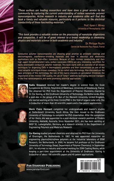IntroductionComposite Materials Altered Behavior of Nano-Fillers Carbon Nanotubes and Composites Thereof Percolation Theory for Rods Scope of This Book Toolbox for Dispersing Carbon Nanotubes into Polymers to Get Electrically Conductive NanocompositesGeneral Introduction Incorporation of CNTs into a Polymer Matrix: A Challenge Ultrasound CNT Purification Methods to Disperse Individual CNTs in a Polymer Matrix Conclusions Tailoring and Monitoring the Sonication-Driven Dispersion of Carbon Nanotubes in Aqueous Surfactant SolutionsIntroduction Characterization of the Bundling of CNT Aqueous Dispersions in General; Monitoring of the Debundling Process in Particular: A Short Overview of Suitable Characterization Techniques Optimization of the CNT Debundling Parameters to Make Conductive CNT/Polymer Nanocomposites with UV-Vis Spectroscopy Food for Thought: A Critic of Purification of SWCNTs Centrifugation of Aqueous Surfactant-CNT Dispersions Conclusions Aspects of Processing Methods and Conditions Affecting Percolation Networks Segregated Networks and Dynamic Percolation The Role of the Matrix Viscosity: Molecular Weight Distributions and Processing Temperatures Processing Techniques and Percolation Thresholds Conclusions On the Versatility of the Latex-Based Process Regarding the Choice of the Polymer Matrix of the NanocompositeIntroduction Semi-Crystalline Polypropylene Matrix Polymer Blends Conclusions Manipulating the Percolation of CNTs Using Hybrid Composite Systems Introduction Eliminating Non-Contact Resistivity General Conclusions Future PerspectivesIntroduction: Toward Large-Scale Production Food for Thought: Possible Applications of CNT/Polymer Composites? What's Next? Index