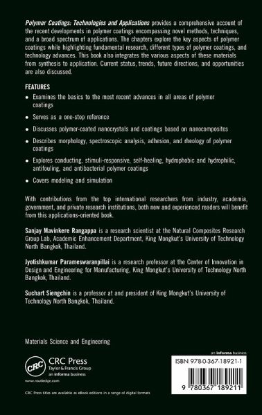 Polymer Coatings: Technologies and Applications provides a comprehensive account of the recent developments in polymer coatings encompassing novel methods, techniques, and a broad spectrum of applications. The chapters explore the key aspects of polymer coatings while highlighting fundamental research, different types of polymer coatings, and technology advances. This book also integrates the various aspects of these materials from synthesis to application. Current status, trends, future directions, and opportunities are also discussed. FEATURES Examines the basics to the most recent advances in all areas of polymer coatings Serves as a one-stop reference Discusses polymer-coated nanocrystals and coatings based on nanocomposites Describes morphology, spectroscopic analysis, adhesion, and rheology of polymer coatings Explores conducting, stimuli-responsive, self-healing, hydrophobic and hydrophilic, antifouling, and antibacterial polymer coatings Covers modeling and simulation With contributions from the top international researchers from industry, academia, government, and private research institutions, both new and experienced readers will benefit from this applications-oriented book. Sanjay Mavinkere Rangappa is a research scientist at the Natural Composites Research Group Lab, Academic Enhancement Department, King Mongkut's University of Technology North Bangkok, Thailand. Jyotishkumar Parameswaranpillai is a research professor at the Center of Innovation in Design and Engineering for Manufacturing, King Mongkut's University of Technology North Bangkok, Thailand. Suchart Siengchin is a professor at and president of King Mongkut's University of Technology North Bangkok, Thailand.