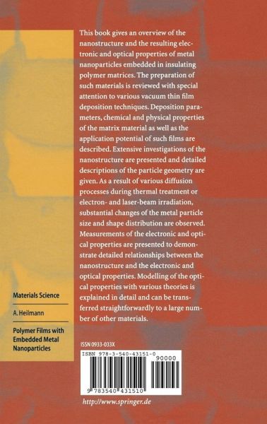 Praise for A. Heilmann's Polymer Films with Embedded Metal Nanoparticles POLYMERNEWS "This book presents an overview of the structure and resulting electronic and optical properties of metal nanoparticles that are embedded in insulating polymer matrices."