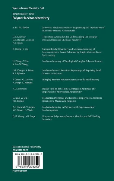 "Polymer mechanochemistry is in many respects a new science, and one of growing interest. ... there is clearly a significant need for a new book that would present the many advances in polymer mechanochemistry. ... This book nicely fills a void in reporting on this growing research area. Summing Up: Recommended. Upper-division undergraduates and above." (P. G. Heiden, Choice, Vol. 53 (8), April, 2016)
