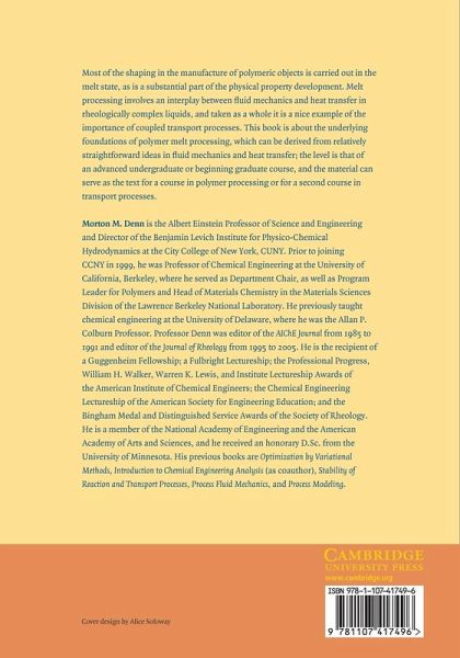 Most of the shaping in the manufacture of polymeric objects is carried out in the melt state, as it is a substantial part of the physical property development. Melt processing involves an interplay between fluid mechanics and heat transfer in rheologically complex liquids, and taken as a whole it is a nice example of the importance of coupled transport processes. This book is on the underlying foundations of polymer melt processing, which can be derived from relatively straightforward ideas in fluid mechanics and heat transfer; the level is that of an advanced undergraduate or beginning graduate course, and the material can serve as the text for a course in polymer processing or for a second course in transport processes.