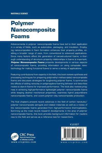Advancements in polymer nanocomposite foams have led to their application in a variety of fields, such as automotive, packaging, and insulation. Employing nanocomposites in foam formation enhances their property profiles, enabling a broader range of uses, from conventional to advanced applications. Since many factors affect the generation of nanostructured foams, a thorough understanding of structure-property relationships in foams is important. Polymer Nanocomposite Foams presents developments in various aspects of nanocomposite foams, providing information on using composite nanotechnology for making functional foams to serve a variety of applications. Featuring contributions from experts in the field, this book reviews synthesis and processing techniques for preparing poly(methyl methacrylate) nanocomposite foams and discusses strategies for toughening polymer foams. It summarizes the effects of adding nanoclay on polypropylene foaming behavior and describes routes to starch foams for improved performance. The books also reviews progress in achieving high-performance lightweight polymer nanocomposite foams while keeping desired mechanical properties, examines hybrid polyurethane nanocomposite foams, and covers polymer-clay nanocomposite production. The final chapters present recent advances in the field of carbon nanotube/polymer nanocomposite aerogels and related materials as well as a review of the nanocomposite foams generated from high-performance thermoplastics. Summing up the most recent research developments in the area of polymer nanocomposite foams, this book provides background information for readers new to the field and serves as a reference text for researchers.
