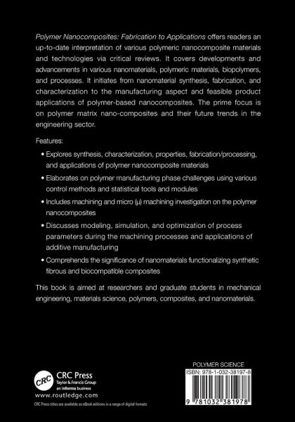 Explores synthesis, characterization, properties, fabrication/processing, and applications of polymer nanocomposite materialsElaborates on polymer manufacturing phase challenges using various control methods and statistical tools and modulesIncludes machining and micro (mi) machining investigation on the polymer nanocompositesDiscusses modeling, simulation, and optimization of process parameters during the machining processes and applications of additive manufacturingComprehends the significance of nanomaterials functionalizing synthetic fibrous and biocompatible composites