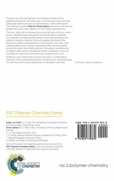 Polymer solar cells have gained much attention as they offer a potentially economic and viable way of commercially manufacturing lightweight, flexible and low-cost photovoltaics. With contributions from leading scientists, Polymer Photovoltaics provides an international perspective on the latest research for this rapidly expanding field. The book starts with an Introduction to polymer solar cells and covers several important topics that govern their photovoltaic properties including the chemistry and the design of new light harvesting and interfacial materials and their structure-property relationship; the physics for photocurrent generation in the polymer solar cells; new characterization tools to study morphology effect on the property of donor/acceptor bulk heterojunctions; new device concepts such as tandem cells and semi-transparent cells and advanced roll-to-roll processes for large-scale manufacturing of polymer solar cells. Written by active researchers, the book provides a comprehensive overview of the recent advancements in polymer solar cell technology for both researchers and students that are interested in this field.